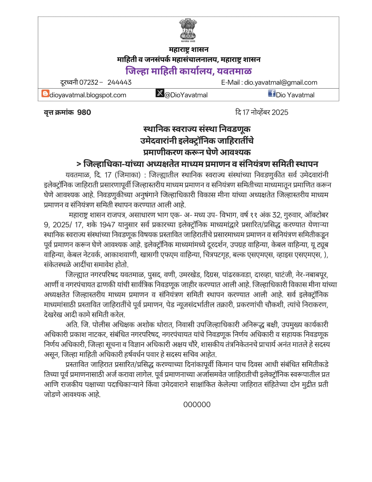 यवतमाळ, जिल्ह्यातील स्थानिक स्वराज्य संस्थांच्या निवडणुकीत सर्व उमेदवारांनी इलेक्ट्रॉनिक जाहिराती प्रसारणापूर्वी जिल्हास्तरीय माध्यम प्रमाणन व सनियंत्रण समितीच्या माध्यमातून प्रमाणित करून घेणे आवश्यक आहे. निवडणुकीच्या अनुषंगाने जिल्हाधिकारी विकास मीना यांच्या अध्यक्षतेत जिल्हास्तरीय माध्यम प्रमाणन व संनियंत्रण समिती स्थापन करण्यात आली आहे.महाराष्ट्र शासन राजपत्र, असाधारण भाग एक- अ- मध्य उप- विभाग, वर्ष ११ अंक 32, गुरुवार, ऑक्टोबर 9, 2025/ 17, शके 1947 यानुसार सर्व प्रकारच्या इलेक्ट्रॉनिक माध्यमांद्वारे प्रसारित/प्रसिद्ध करण्यात येणाऱ्या स्थानिक स्वराज्य संस्थांच्या निवडणूक विषयक प्रस्तावित जाहिरातींचे प्रसारमाध्यम प्रमाणन व सनियंत्रण समितीकडून पूर्व प्रमाणन करून घेणे आवश्यक आहे. इलेक्ट्रॉनिक माध्यमांमध्ये दूरदर्शन, उपग्रह वाहिन्या, केबल वाहिन्या, यू ट्यूब वाहिन्या, केबल नेटवर्क, आकाशवाणी, खासगी एफएम वाहिन्या, चित्रपटगृह, बल्क एसएमएस, व्हाइस एसएमएस, ), संकेतस्थळे आदींचा समावेश होतो.जिल्ह्यात नगरपरिषद यवतमाळ, पुसद, वणी, उमरखेड, दिग्रस, पांढरकवडा, दारव्हा, घाटंजी, नेर-नबाबपूर, आर्णी व नगरपंचायत ढाणकी यांची सार्वत्रिक निवडणूक जाहीर करण्यात आली आहे. जिल्हाधिकारी विकास मीना यांच्या अध्यक्षतेत जिल्हास्तरीय माध्यम प्रमाणन व संनियंत्रण समिती स्थापन करण्यात आली आहे. सर्व इलेक्ट्रॉनिक माध्यमांसाठी प्रस्तावित जाहिरातींचे पूर्व प्रमाणन, पेड न्यूजसंदर्भातील तक्रारी, प्रकरणांची चौकशी, त्यांचे निराकरण, देखरेख आदी कामे समिती करेल.अति. जि. पोलीस अधिक्षक अशोक थोरात, निवासी उपजिल्हाधिकारी अनिरूद्ध बक्षी, उपमुख्य कार्यकारी अधिकारी प्रकाश नाटकर, संबंधित नगरपरिषद, नगरपंचायत यांचे निवडणूक निर्णय अधिकारी व सहायक निवडणूक निर्णय अधिकारी, जिल्हा सूचना व विज्ञान अधिकारी अक्षय चौरे, शासकीय तंत्रनिकेतनचे प्राचार्य अनंत मातले हे सदस्य असून, जिल्हा माहिती अधिकारी हर्षवर्धन पवार हे सदस्य सचिव आहेत.प्रस्तावित जाहिरात प्रसारित/प्रसिद्ध करण्याच्या दिनांकापूर्वी किमान पाच दिवस आधी संबंधित समितीकडे तिच्या पूर्व प्रमाणनासाठी अर्ज करावा लागेल. पूर्व प्रमाणनाच्या अर्जासमवेत जाहिरातीची इलेक्ट्रॉनिक स्वरूपातील प्रत आणि राजकीय पक्षाच्या पदाधिकाऱ्याने किंवा उमेदवाराने साक्षांकित केलेल्या जाहिरात संहितेच्या दोन मुद्रीत प्रती जोडणे आवश्यक आहे.